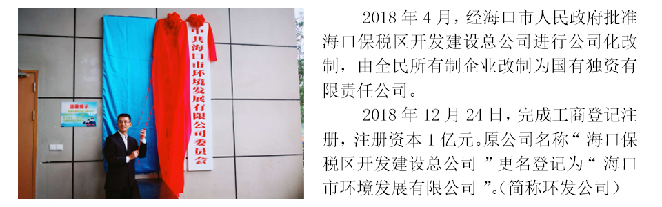 ??谑协h境發展有限公司是海口市屬國有獨資有限責任公司,于2018年12月正式掛牌運營,注冊資本1億元,由1993年12月成立的海口保稅區開發建設總公司進行公司化改制而成,核心業務為環境環衛產業投資和運營、資產運營和管理,培育業務為工程管理